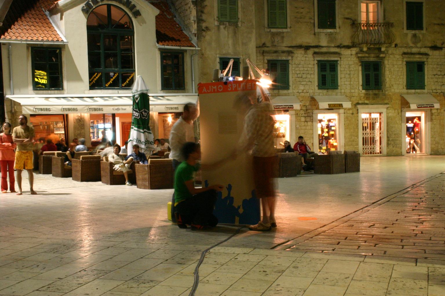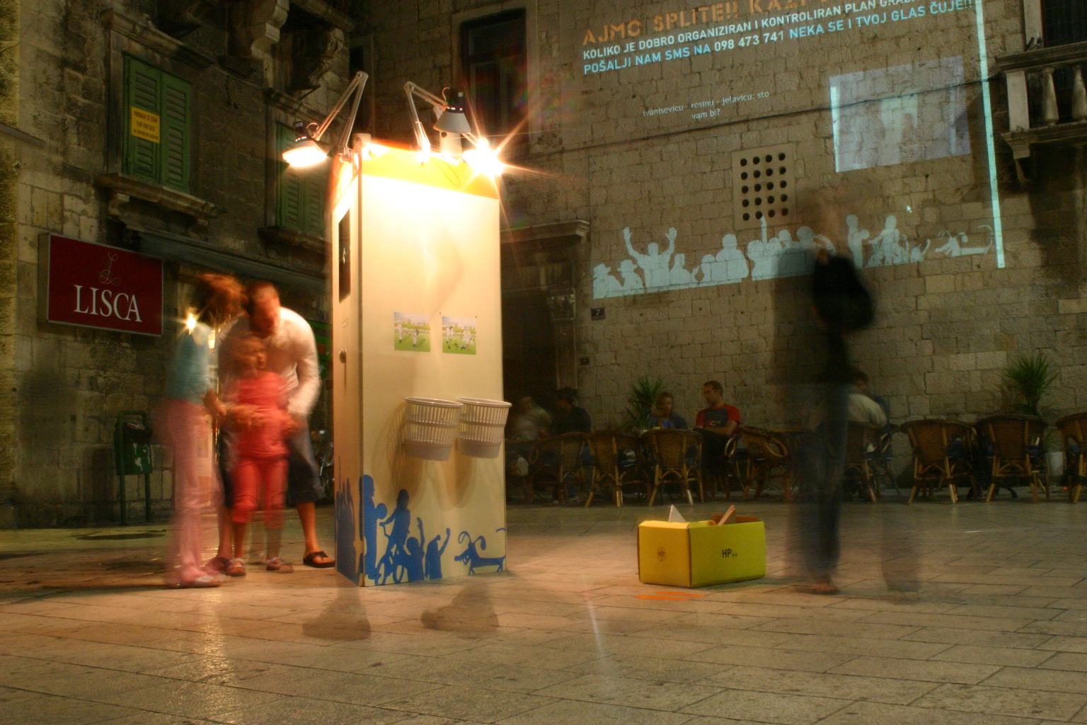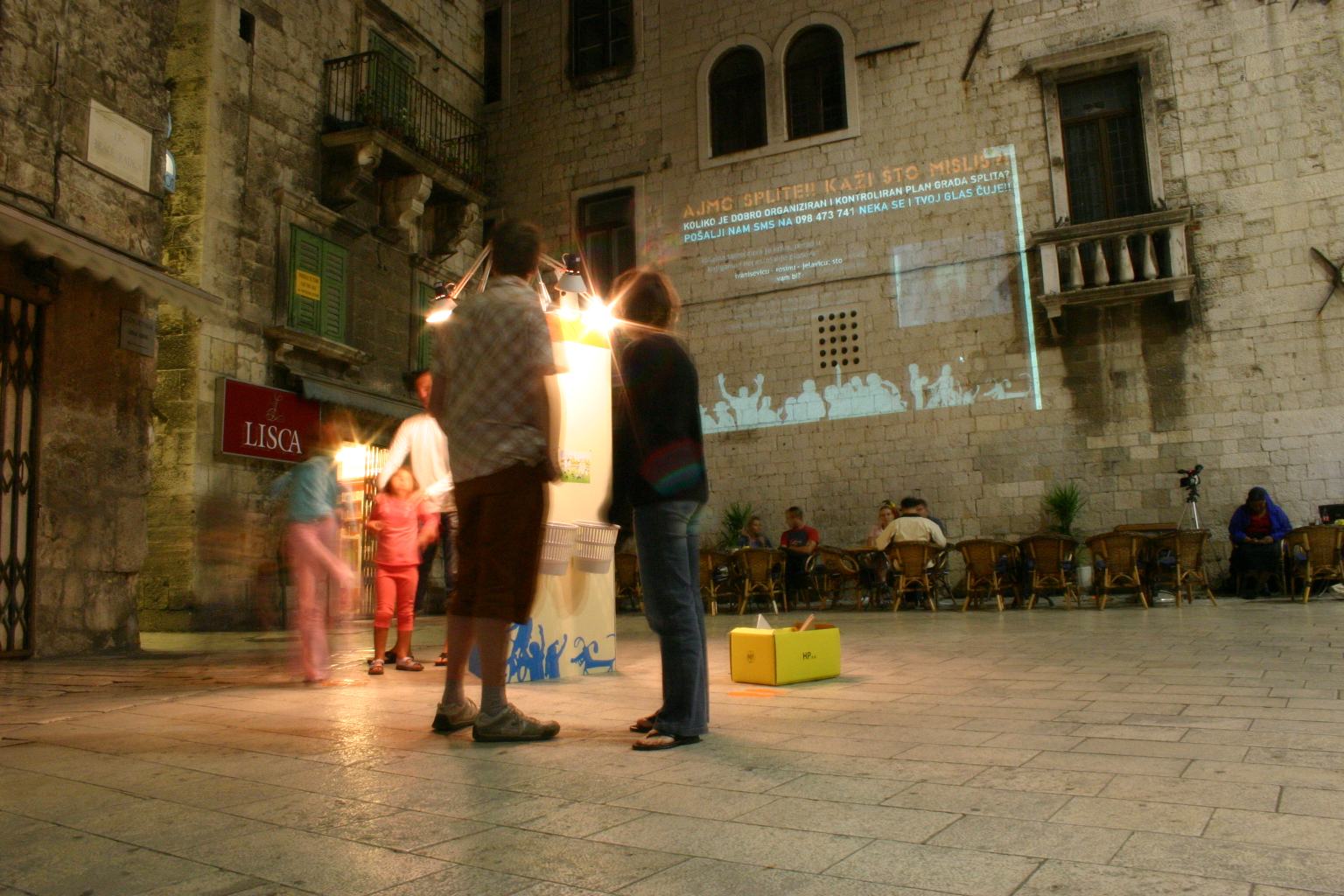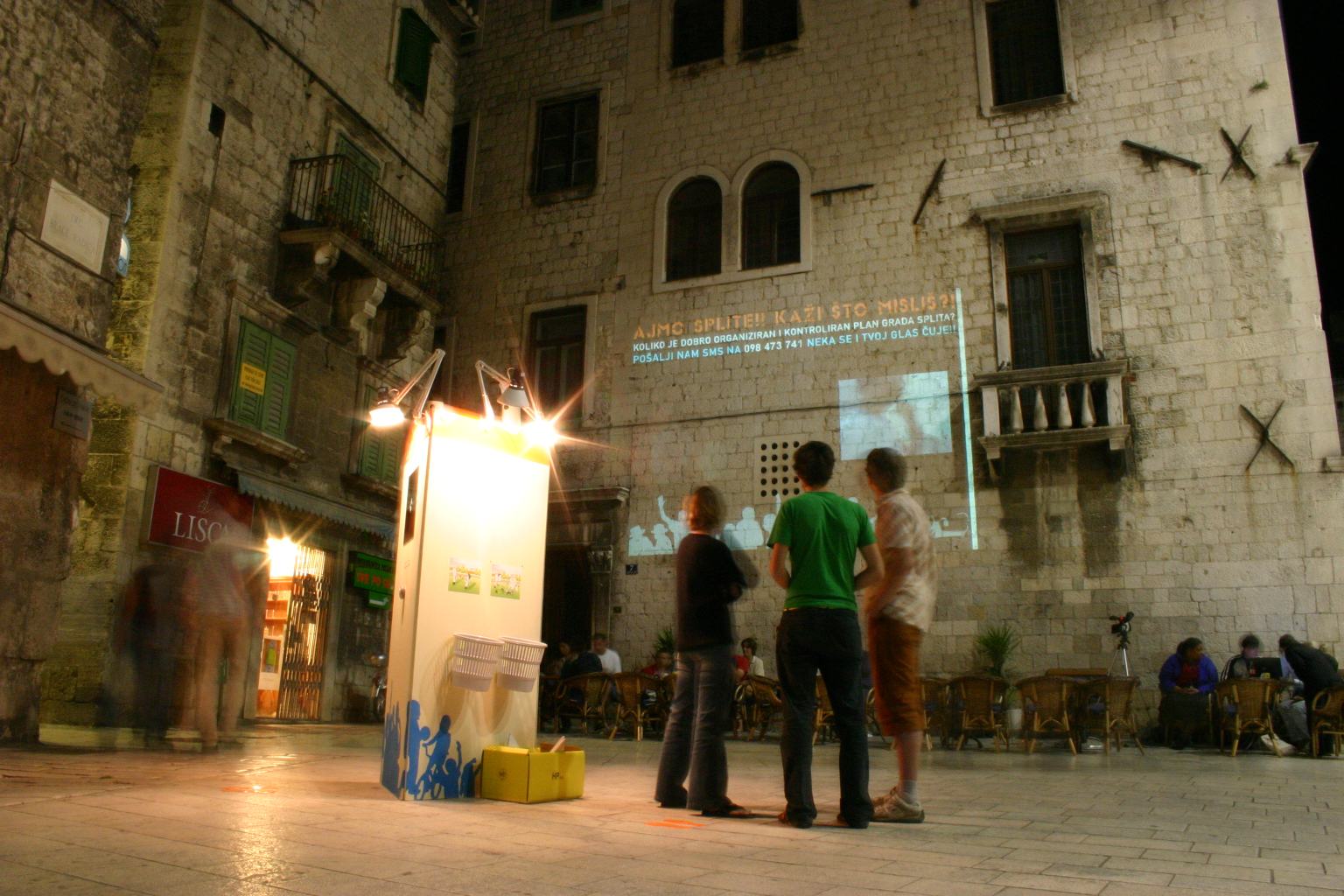 Rad je nastao tijekom ljetne škole dizajna interakcija “Convivio – Communities in Transition”. Riječ je o prototipu interaktivnog kioska koji je dizajniran s ciljem olakšavanja dijaloga građana Splita i lokanih vlasti oko urbanističkog planiranja. Izveden je procesom dizajna usmjerenog korisnicima, a metodologija rada uključivala je evaluaciju sa stvarnim korisnicima u stvarnom kontekstu. Instalacija je tijekom jedne večeri bila smještena na javnom gradskom prostoru u centru. Sadržavala je video kameru i video projektor koji je projicirao video s brojem na koji su prolaznici mogli slati svoja mišljenja anonimnim SMS porukama. Poruke su se, uz snimljene reakcije građana prikazivale na obližnjoj zgradi. Instalacija je izazvala veliki interes među građanima.