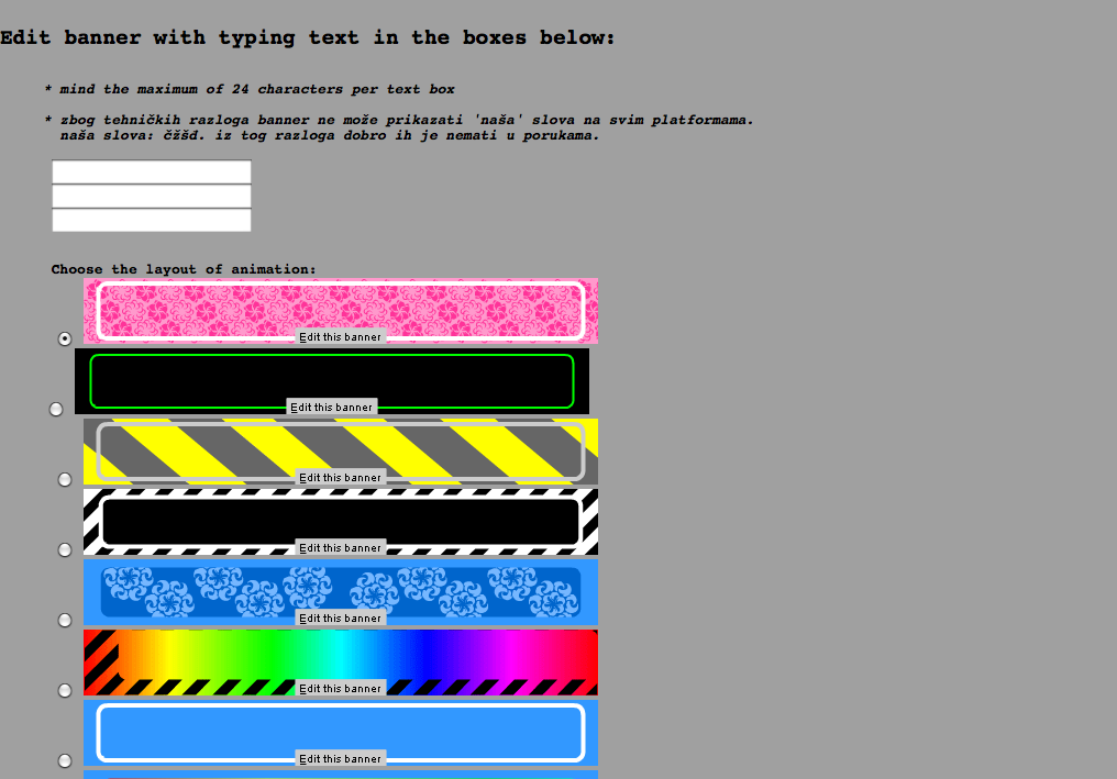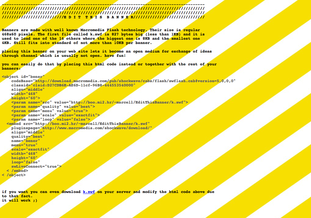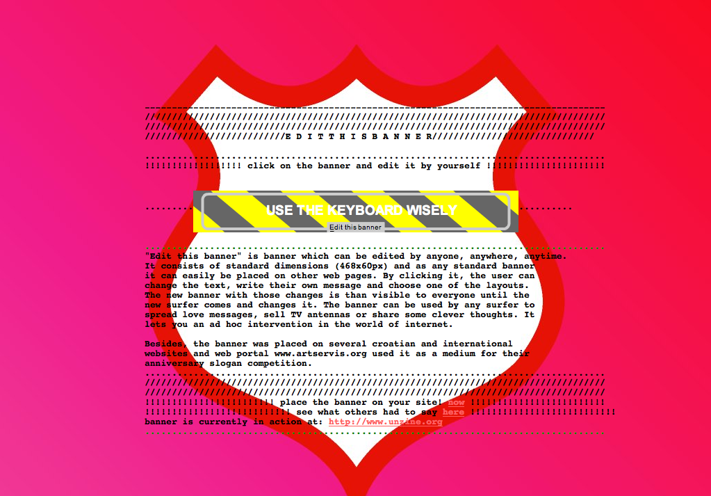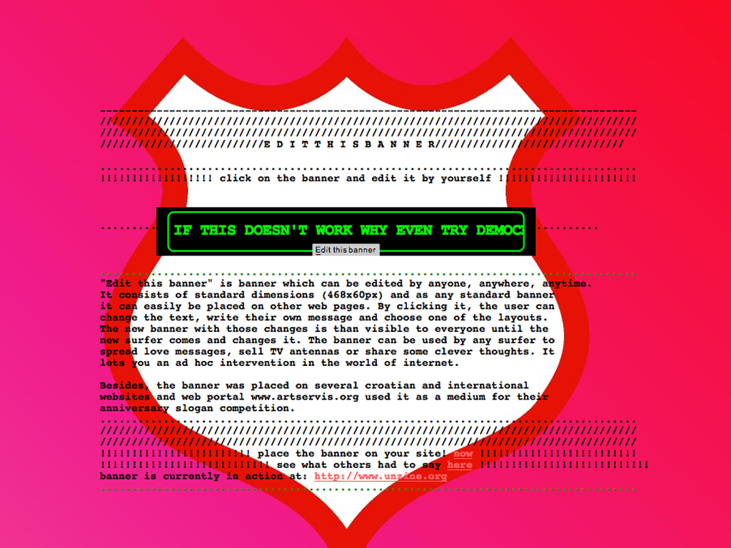 Lina Kovačević svoj rad “Edit This Banner” naziva “interaktivnom web instalacijom”. Riječ je o web stranici koja omogućava personaliziranu izradu Flash internet bannera. Korisnicima je na stranici projekta ponuđena mogućnost personalizacije upisivanjem teksta i odabirom layouta, te postavljanjem proizvoljnog linka na koji će bannner voditi. Banner je standardnih dimenzija, pa ga je bilo moguće smjestiti na bilo koje drugo web sjedište na kojem on postaje dinamičan i nepredvidljiv dio sadržaja. Na ovaj način stvaranje sadržaja postaje dostupno krajnjem korisniku, a prostor koji je zakupljen na određenom portalu postaje potpuno nekontroliran i zavisan od “slučajnih oglašivača”. Autorica navodi da ovaj projekt oglašivački prostor interneta pretvara u prostor “hyperlink graffita”.