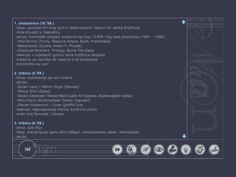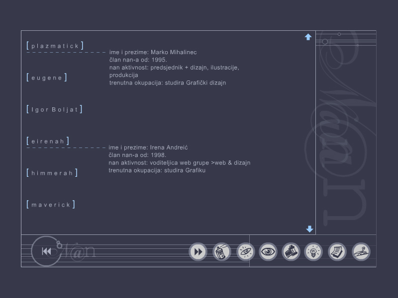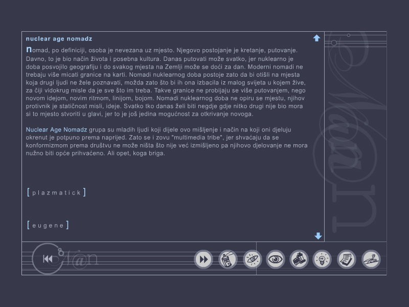 Nuclear Age Nomadz (NAN) započinje u Zaprešiću kao lokalna aktivnost u želji za formiranjem nove gradske scene. Udruga 1999. godine započinje organiziranje tribina, izložbi, koncerata i drugih aktivnosti. Pozicija izvan centra mainstream kulture omogućila je fleksibilnost rada, a aktivnosti udruge odnosile su se na stjecanje novih znanja koja do tada nije bilo moguće dobiti putem formalnog obrazovanja, a što se prije svega odnosilo na nove medije. Dizajnersku okosnicu udruge činili su Marko Mihalinec i Irena Andreić. Oni su autori prvog web sjedišta NAN-a koje je, u skladu s interesima za promoviranje i eksperimentiranje s novim tehnologijama, izvedeno u Flash tehnologiji. Web je 2000. godine nagrađen mi2 web nagradom.
