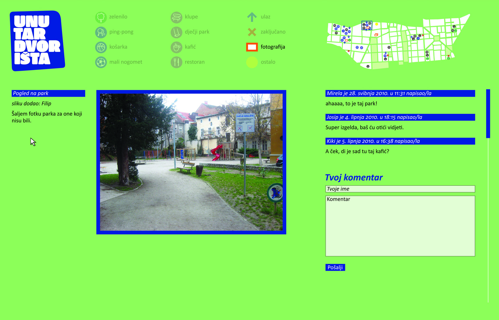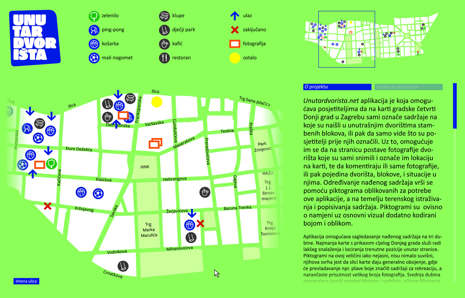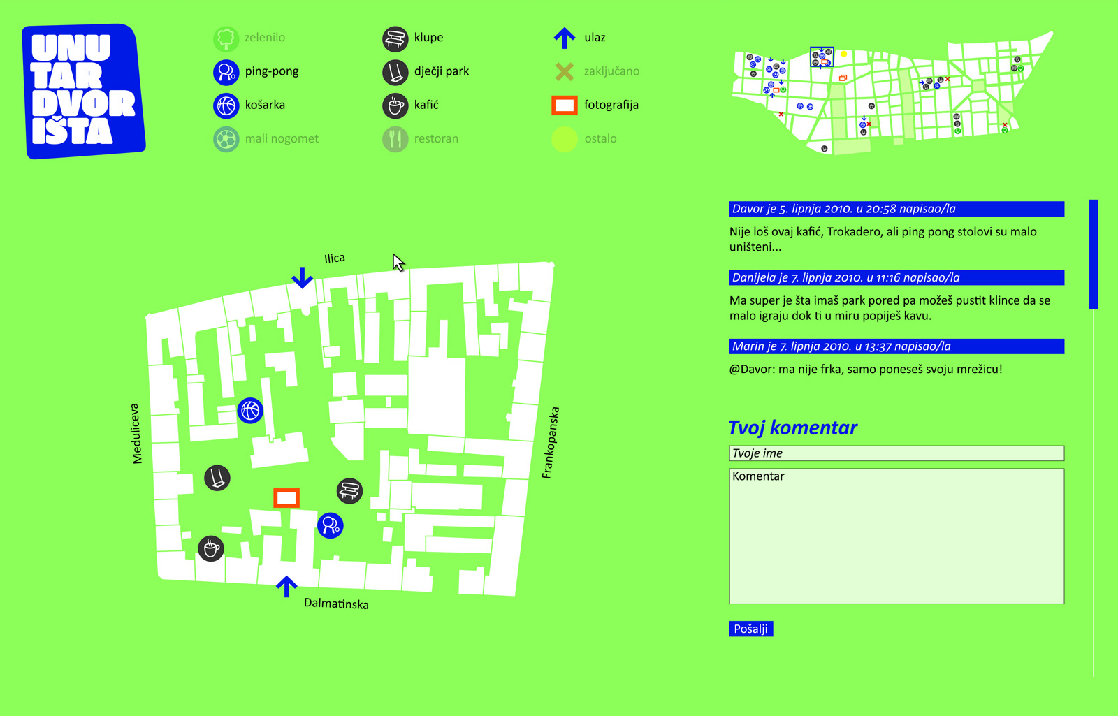 Rad Unutar dvorišta zapravo je prototip Flash web aplikacije, izveden na Studiju dizajna. Cilj projekta bio je pronaći nenametljiv i jednostavan način da se građane informira o dijelovima gradske četvrti Donji grad u Zagrebu koji najčešće nisu vidljivi, te ih uključiti u projekt mapiranja tih dijelova grada. Prototip omogućuje posjetiteljima da na karti sami označe i komentiraju sadržaje na koje su naišli u unutrašnjim dvorištima stambenih blokova, ili pak da samo vide ono što su posjetitelji prije njih označili. Rad je zanimljiv prije svega kao pokušaj da se povežu aktivnosti korisnika u virtualnom i stvarnom svijetu, tj. napravi korak dalje od računalnog zaslona.